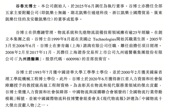 资料显示,谷春光,55岁,公司创始人,于2025年6月调任为执行董事。谷春光亦担任全部五家主要附属公司(即凯乐士无锡、湖北凯乐仕通达科技、浙江凯乐士国际贸易、广东凯乐仕佳的及安徽凯乐仕)的董事或监事。