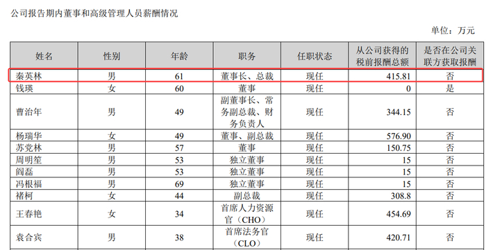 值得一提的是,秦英林已经连续两年涨薪,其2023年、2024年的薪酬分别为235万元、372.19万元。