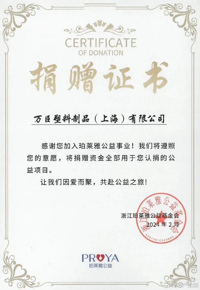 去年11月末,万臣发布倒闭公告。而在此前的2024年2月,其官方微信公众号还曾发布加入珀莱雅公益基金会的推文。