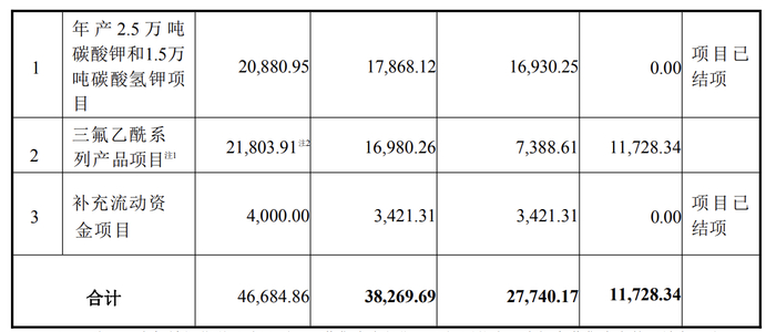回溯来看,大洋生物的募资之路始于 2020 年 10 月,公司通过 IPO 公开发行 1500 万股,发行价 28.85 元 / 股,募集资金总额 4.33 亿元,扣除发行费用后实际净额 3.83 亿元。截至 2025 年 11 月 30 日,公司累计使用募集资金 2.77 亿元,剩余 1.17 亿元尚未投入使用。其中,年产 2.5 万吨碳酸钾、1.5 万吨碳酸氢钾项目及补充流动资金项目已完成结项,而备受关注的三氟乙酰系列产品项目累计投入 7388.61 万元,剩余募集资金全部沉淀于此。
