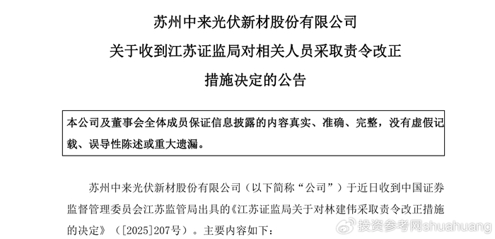 监管机构在此次责令改正通知中,要求林建伟充分重视相关问题,吸取教训,及时整改,杜绝类似问题再次发生。对于中来股份而言,如何推动林建伟履行补偿义务、弥补资金损失,同时改善自身经营状况、缓解财务压力,成为当前亟待解决的难题。业内人士分析认为,中来股份当前需聚焦核心业务,优化产能布局,提升运营效率,同时理顺债务结构,借助国企背景(2022年浙江省国资委通过浙能电力成为公司实控人)争取更多资源支持。若无法有效改善经营状况,公司后续发展或将面临更大挑战。