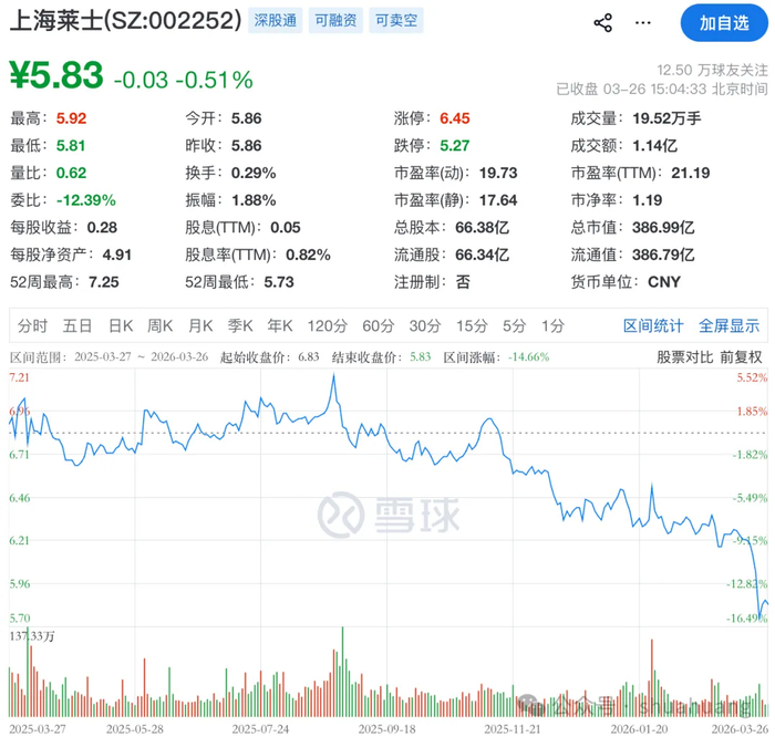 投资参考网记者梳理年报数据发现,公司第四季度业绩出现深度滑坡,净利润同比暴跌超70%,核心产品营收与毛利率双双下滑,同时商誉规模大幅攀升,经营活动现金流由正转负,多重压力集中显现。截至3月26日收盘,上海莱士报5.83元/股,当日下跌0.51%,总市值定格在386.99亿元。