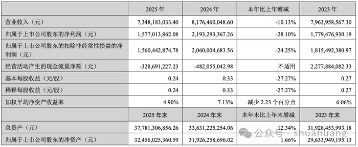资产负债端数据显示,截至2025年末,公司总资产377.81亿元,较上年度末增长12.3%;归母净资产324.56亿元,较上年度末仅增长1.7%,资产规模扩张与净资产增长出现明显背离。现金流层面,公司2025年经营活动产生的现金流量净额为-3.29亿元,较上一年度的现金净流入出现大幅逆转,经营性现金流转负也为公司后续经营稳定性敲响警钟。