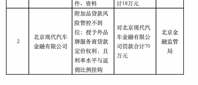 11月7日,国家金融监督管理总局官网显示,北京现代汽车金融有限公司因“附加品贷款风险管控不到位;授予外品牌服务商贷款定价权利且利率水平与返佣比例挂钩”被北京金融监管局罚款合计70万元。