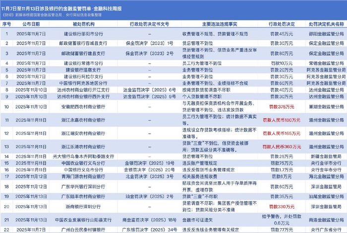 11月7日至11月13日,央行、国家金融监督管理总局官网披露了22张涉及银行的罚单。