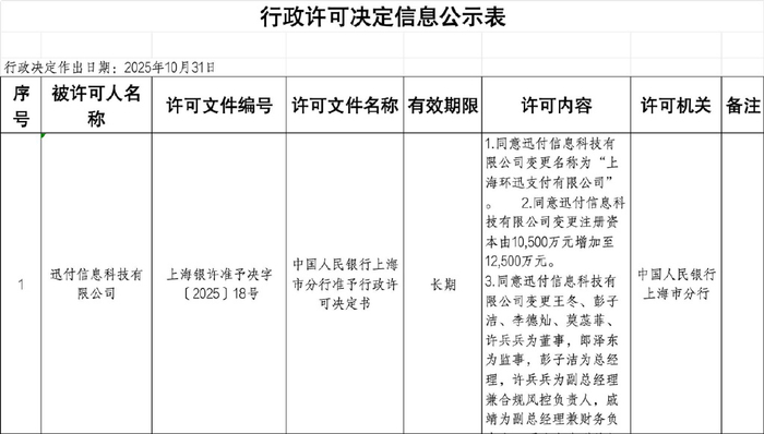11月11日,央行上海市分行披露的许可信息显示,同意迅付信息科技有限公司变更名称为“上海环迅支付有限公司”;同意其变更注册资本由1.05亿元增加至1.25亿元;同意该公司变更彭子洁为总经理,许兵兵为副总经理兼合规风控负责人,戚靖为副总经理兼财务负责人,覃业金为副总经理兼技术负责人,莫蕊菲为副总经理等。