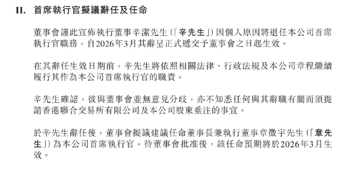 11月11日,连连数字公告称,公司现任首席执行官辛洁因个人原因,将于2026年3月辞去首席执行官职务。辞任生效后,辛洁将继续以顾问身份为公司产业生态建设和资本运作提供专业支持。连连数字董事长兼执行董事、创始人章征宇将于2026年3月正式出任首席执行官。章征宇自2009年创办连连数字以来至2023年3月,一直担任公司的董事长兼首席执行官。