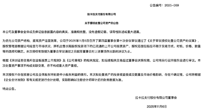 11月6日,拉卡拉支付股份有限公司发布《关于授权处置公司资产的公告》称,公司于2025年11月5日召开第四届董事会第十次会议审议通过了《关于审议授权处置公司资产的议案》。此次授权管理层可依据公司经营状况与市场行情,灵活择机出售长期股权投资项下已流通的上市公司股票资产,授权涵盖交易方式、时机、价格、数量等多方面的选择与确定。