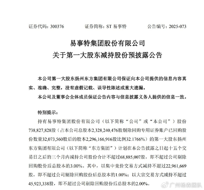 2025年11月19日,易事特300376披露《关于第一大股东减持股份预披露公告》。