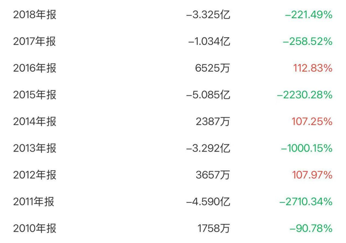 数据显示,在2010年至2018年间,莲花控股多个财年净利润亏损,其中2011年亏损4.59亿元,2013年亏损3.29亿元,2015年亏损5.09亿元,2017年亏损1.03亿元,2018年亏损3.33亿元。