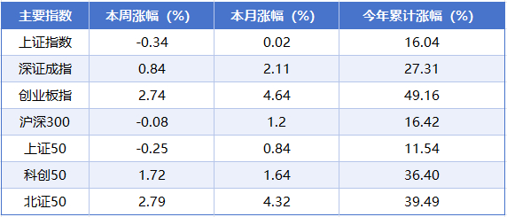 指数层面,本周A股主要指数涨多跌少,其中北证50、创业板指、科创50等指数涨幅位居前列,分别上涨2.79%、2.74%和1.72%,反映出科技板块本周迎来阶段性反弹行情。从年度表现来看,创业板指今年以来累计涨幅达到49.16%,遥遥领先其他指数;北证50、科创50同期累计涨幅亦表现亮眼,分别达到39.49%、36.40%。
