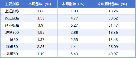指数层面,本周A股主要指数呈现反弹趋势,其中创业板指涨幅领先,累计上涨3.9%;深证成指和科创50紧随其后,本周累计涨幅分别为3.53%和2.85%。从年度表现来看,创业板指依旧保持领先,年内累计涨幅达到51.47%,北证50、科创50分列第二和第三位,年内累计涨幅分别为40.97%、36.09%。