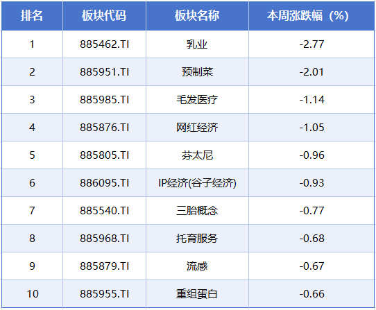 本周排在跌幅榜前排的概念板块分别是乳业、预制菜、毛发医疗、网红经济、芬太尼,累计跌幅分别为2.77%、2.01%、1.14%、1.05%、0.96%。