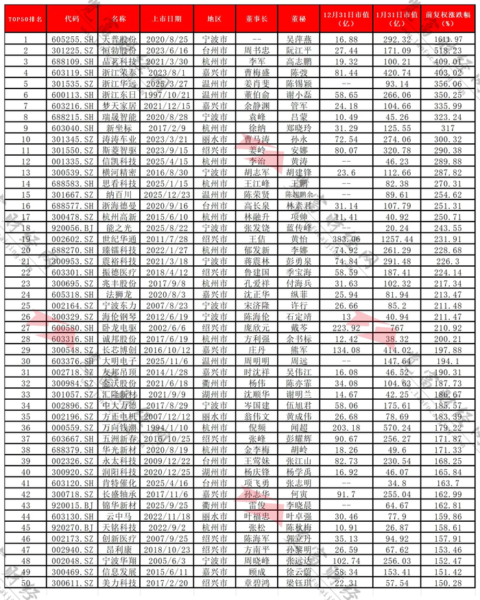 2025年浙江省A股上市公司涨幅前TOP50排行: