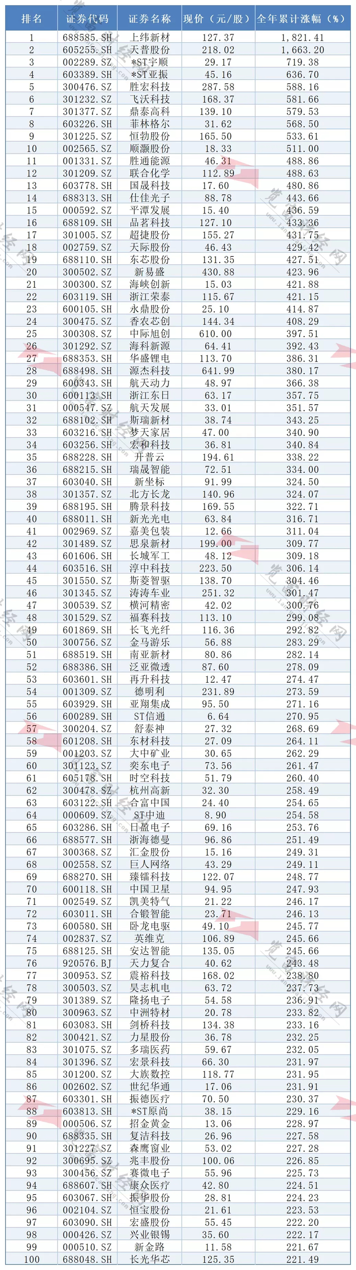 天普股份全年累计上涨1663.20%,位居全年涨幅榜第二名。天普股份自8月22日涨停启动,连续收出15连板,期间累计上涨318.55%。在经历了1个月的调整后,该股便再次启动并震荡上行。该股的上涨也与一则公告有关,天普股份实控人尤建义等与中昊芯英、方东晖签署《股份转让协议》。同时,中昊芯英、海南芯繁、方东晖与公司控股股东天普控股签订《增资协议》。协议转让完成后,中昊芯英实控人杨龚轶凡将成为天普股份的新实控人,杨龚轶凡曾是谷歌芯片团队成员。