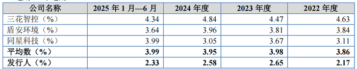 2022年至2025年上半年,恒基金属研发费用分别为2063.74万元、2240.4万元、2623.94万元、1,571.75万元,占营业收入的比例为2.17%、2.65%、2.58%、2.33%,低于同行均值。