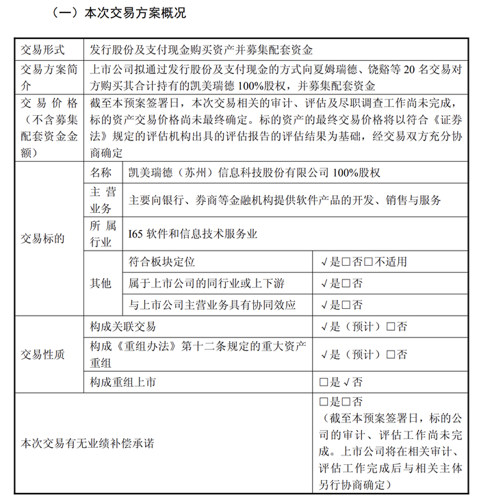 11月11日,凌志软件(688588.SH)复牌并披露并购预案,拟通过发行股份及支付现金方式购买凯美瑞德(苏州)信息科技股份有限公司(下称“标的”或“凯美瑞德”)100%股权,并同步募集配套资金。该笔交易预计构成重大资产重组,交易价格等核心信息有待标的估值确定后进一步披露。