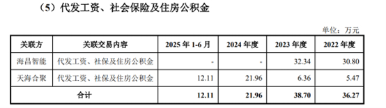 图源:海昌智能招股书海昌智能在招股书中提到:公司委托天海电子的孙公司天海雪城电子为某员工缴纳社保公积金,2024年1月开始,公司不再委托雪城电子为员工代缴社保公积金。