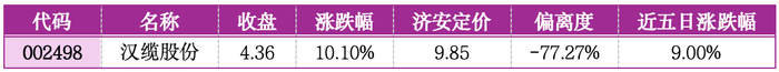 机会提示:汉缆股份偏离济安定价-77.27%,处于极度深度折价状态。作为电力设备领域的细分龙头,公司基本面稳健且受益于电力基建落地,近五日温和上涨后涨停确立止跌回升信号,股价向合理估值回归的空间显著,安全边际极高。