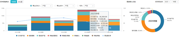 反映在营收结构上,手术治疗业务的营收占比已从2022年上半年的67.8%收缩至2025年同期的46.23%。