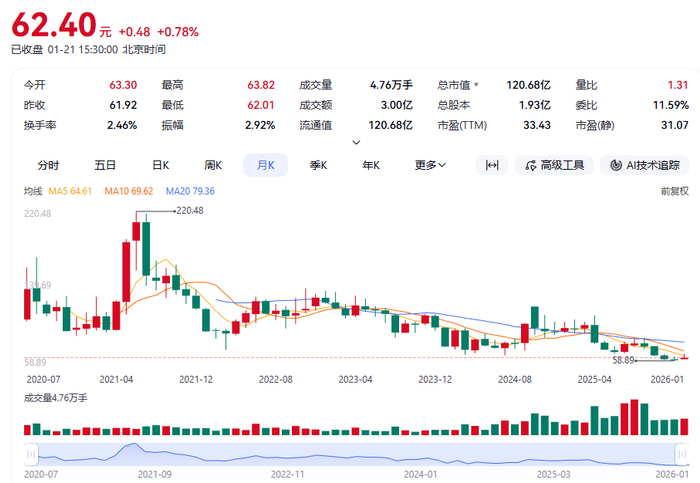 截至最新收盘日,公司股价报62.4元/股,过去一年累计回撤幅度已突破36%,市值缩水显著。