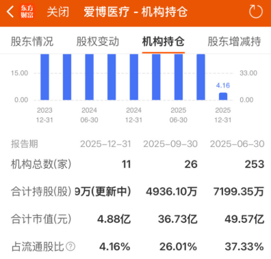 叠加医保DRG(疾病诊断相关分组)控费导致终端手术量超预期下滑等因素,机构投资者开始纷纷撤离。截至2025年12月31日,机构持仓家数已从年中的253家,锐减至仅11家;合计持股数占流通股比例从37.33%大幅回落至4.16%,对应持股市值从49.57亿元缩水至4.88亿元。