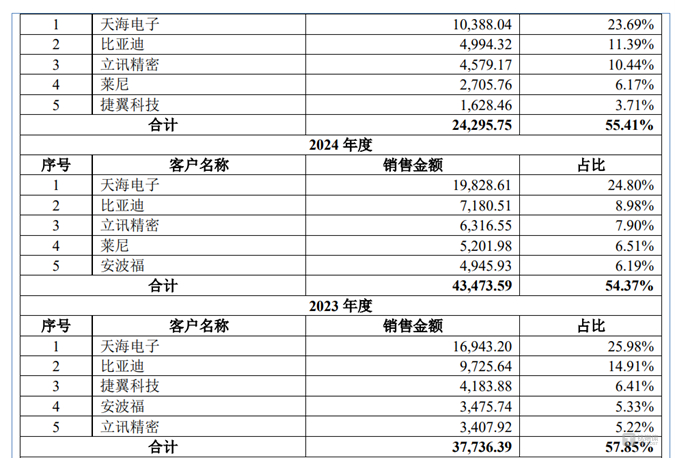 因此以汽车线束生产企业或自产线束的汽车企业为主,第一大客户为关联方天海电子,其他大客户还包括比亚迪(002594.SZ)、立讯精密(002475.SZ)等,集中程度较高,前五大客户占比近几年在54%以上。