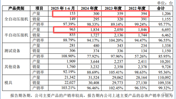 报告期内,公司核心产品全自动压接机产量从394台降至300台,半自动压接机等其他产品产量也呈现波动。北交所首轮问询中要求公司结合在手订单和未来订单获取能力等,分析说明新增产能消化措施及其有效性,是否存在产能过剩或无法消化的风险,并进行必要的风险揭示。第二轮问询中要求公司进一步测算项目达产后预计增加产能、产能利用率情况,分析是否存在产能过剩的风险。