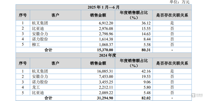 这种增长源自与核心大客户的深度绑定。公司前五大客户贡献的收入长期占比超过八成,其中第一大客户杭叉集团一度贡献超过公司一半营收,即便比例此后有所下降,2025年上半年仍在三成以上,各报告期内分别达到52.95%、44.69%、42.16%和 36.12%。