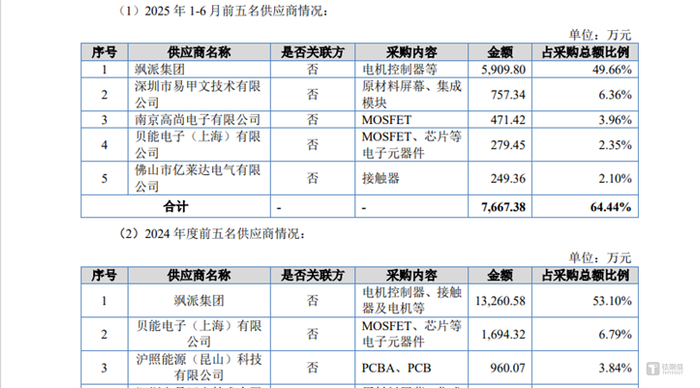 图源:公司公告而在上游,同期嘉晨智能向前五大供应商采购金额分别为1.32亿元、1.82亿元和1.71亿元,占当期采购总额的比例分别为65.47%、79.89%及68.29%。其中,向第一大供应商飒派集团采购金额分别为0.93亿元、1.6亿元和1.33亿元,占当期采购总额的比例分别为45.94%、69.96%和53.1%。