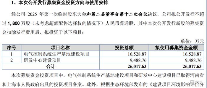 与换赛道同步,公司募投方案进行调整“瘦身”。从科创板阶段的5.36亿元到北交所方案中的2.6亿元,募资规模几乎腰斩,投向也从更具外延意味的“新能源车辆智能驱动控制系统基地”收缩为围绕现有主业的电气控制系统生产基地和研发中心。