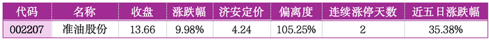 个股层面,百川能源、皖天然气、锦江航运较济安定价分别低估 58.33%、50.27%、49.49%,估值折价显著,叠加所属板块景气度回升,具备稳健的估值修复机会;而准油股份、潜能恒信、华如科技偏离度均超 68%,最高达 105.25%,估值严重泡沫化,且均为 2 连板,短期涨幅透支预期,投机风险极高。