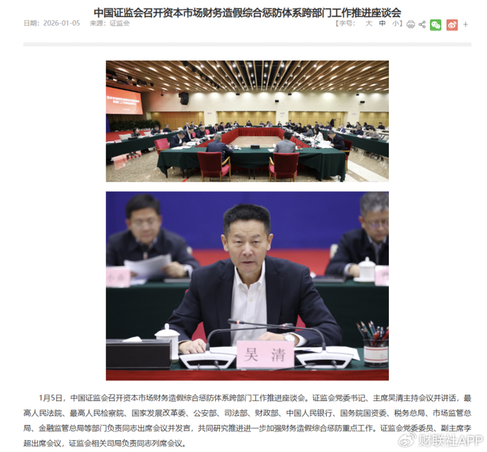 财联社1月6日讯(记者 林坚)2026开年第一场证监会会议备受关注,这次主题与打击资本市场财务造假有关。1月5日,证监会牵头召开资本市场财务造假综合惩防体系跨部门工作推进座谈会,最高法、最高检、公安部等11个部门负责人参会,明确将以“组合拳”深化财务造假综合惩防,对造假与第三方配合造假一体打击。