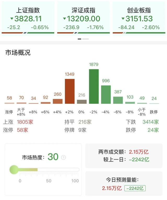 财联社9月26日讯,市场全天震荡调整,创业板指跌超2.5%。沪深两市成交额2.15万亿,较上一个交易日缩量2242亿。盘面上,市场热点较为杂乱,题材强度一般,全市场超3400只个股下跌。从板块来看,风电板块走强,吉鑫科技晋级2连板,威力传动20cm涨停。半导体板块内出现分歧,华虹公司逆势大涨创历史新高,但立昂微、凯美特气双双跌停。有色金属方向表现活跃,精艺股份成功晋级3连板。下跌方面,游戏板块集体下跌,吉比特跌停。算力硬件股走弱,青山纸业跌停。截至收盘,沪指跌0.65%,深成指跌1.76%,创业板指跌2.60%。