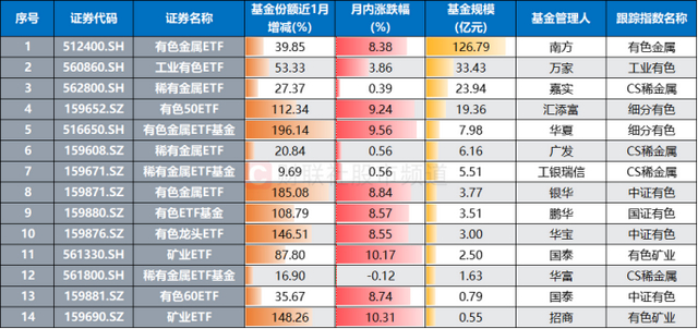 注:有色金属相关ETF近1个月基金份额变动情况(基金规模、份额截至9月26日,其余数据截至9月29日)