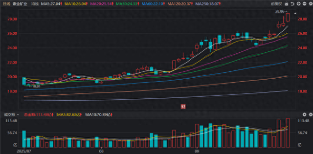 近期,紫金矿业股价表现活跃,截至今日收盘,其已实现7日连涨,连涨天数目前仅次于9月中旬起便持续上涨的华海清科(10连涨)。从量能数据上看,紫金矿业今日放量明显,全天成交额达119.90亿元,创去年10月8日以来新高,同时在整个历史行情中位居第三位,仅次于2024年10月8日(130.99亿元)以及同年9月30日(119.90亿元)。