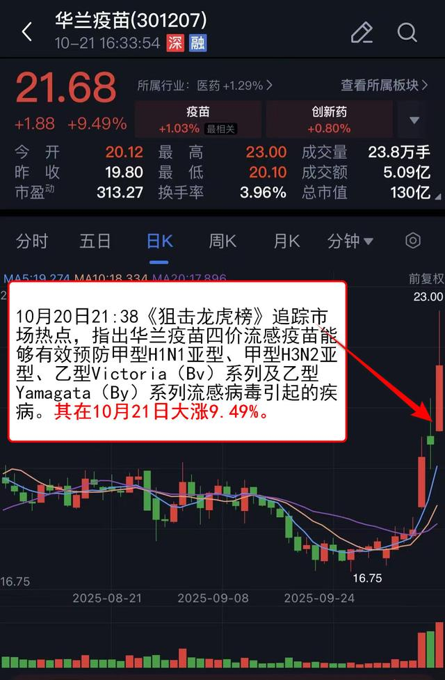 10月20日21:38《狙击龙虎榜》 追踪市场热点,指出华兰疫苗四价流感疫苗能够有效预防甲型H1N1亚型、甲型H3N2亚型、乙型Victoria(Bv)系列及乙型Yamagata(By)系列流感病毒引起的疾病。其在10月21日大涨9.49%。