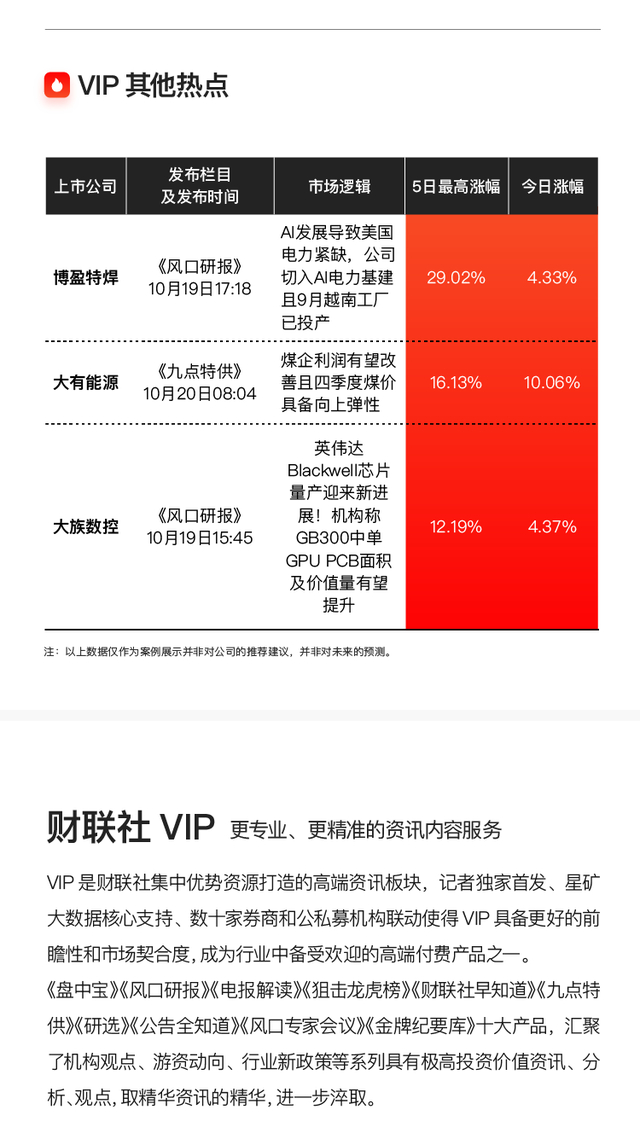 注:财联社VIP为内容资讯产品,并非投资建议。以下内容仅为资讯价值展示非对相关公司的推荐建议,非未来走势预测。投资有风险,入市需谨慎。