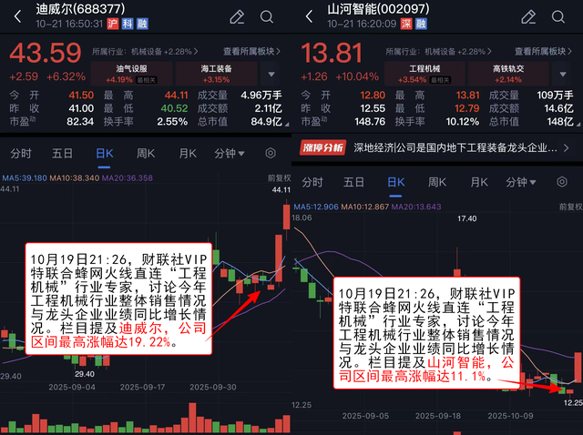 10月19日21:26,财联社VIP特联合蜂网火线直连“工程机械”行业专家,讨论今年工程机械行业整体销售情况与龙头企业业绩同比增长情况。栏目汇总专家观点于文章,文中提及迪威尔,公司去年Q3基数极低但今年深海采油设备订单放量,压裂设备阀体交付量同比增长220%。此外,山河智能矿山无人驾驶技术获力拓集团认证,其全电动矿卡拿下非洲最大锂矿5年代理协议。截至10月21日收盘,山河智能区间最高涨幅达11.1%,迪威尔区间最高涨幅达19.22%。