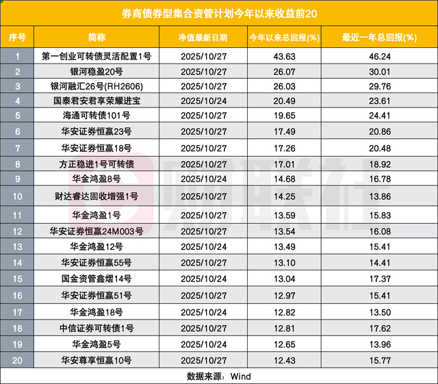 债券型产品收益前20中,第一创业可转债灵活配置1号以43.63%的收益领跑,远超传统债券型产品收益水平,银河稳盈20号(26.07%)、银河融汇26号(26.03%)分别位列第二、第三,三只产品均以可转债为主要投资标的,受益于今年可转债市场的结构性行情。