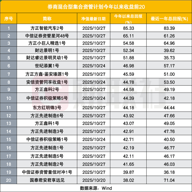 券商混合型集合资管计划今年以来收益前20中,主题投资类产品引领混合型产品收益榜单。方正智能汽车2号以85.33%的收益夺冠,中信证券资管星河48号(65.11%)、方正小巨人精选1号(54.58%)紧随其后,产品聚焦智能汽车、高端制造等热门赛道,在市场行情推动下实现收益较好。