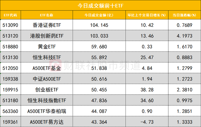 从成交额前十的ETF来看,香港证券ETF(513090)成交额位居首位,港股创新药ETF(513120)成交额位居次席。