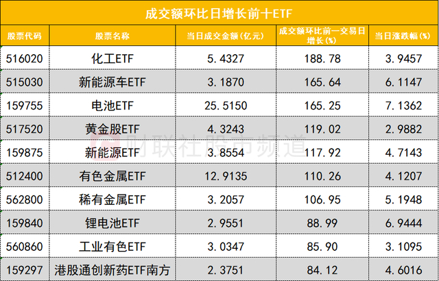 从成交额环比增长前十的ETF来看,化工ETF(516020)成交额环比增长188%位居首位;新能源车ETF(515030)成交额环比增长165%位居次席。