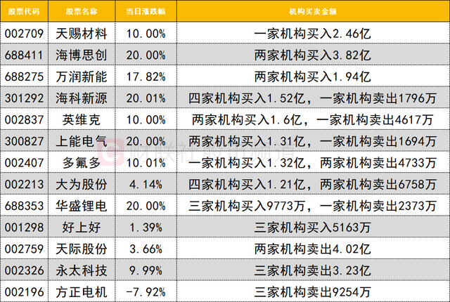 今日龙虎榜机构活跃度明显提升,买入方面,天赐材料今日涨停,获一家机构买入2.46亿。液冷服务器概念股英维克获两家机构买入1.6亿,遭一家机构卖出4617万。海博思创尾盘涨停,获两家机构买入3.82亿。