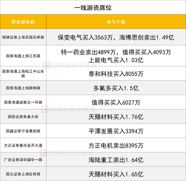 一线游资活跃度较高,电解液龙头股天赐材料获两家一线游资席位(国投证券西安朱雀大街、国元证券上海虹桥路)分别买入1.76亿、1.65亿。多氟多获国泰海通证券上海新闸路席位买入1.5亿。