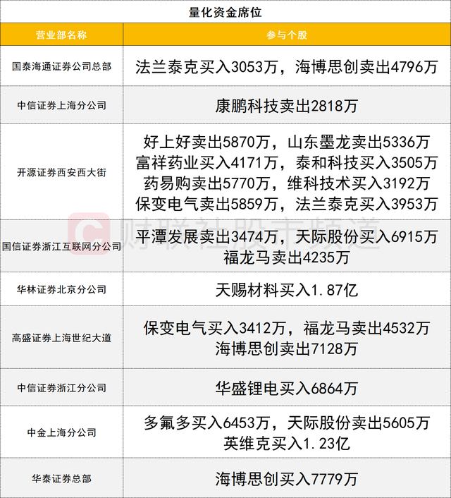 量化资金活跃度有所提升,天赐材料获一家量化席位(华林证券北京分公司)买入1.87亿。英维克获一家量化席位大笔买入1.23亿。