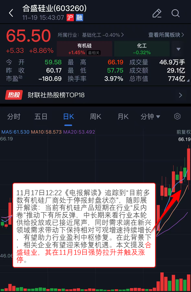 11月17日12:22《电报解读》 追踪到“目前多数有机硅厂商处于停报封盘状态”,随即展开解读:当前有机硅产品短期在行业“反内卷”推动下有所反弹,中长期来看行业本轮供给投放或已接近尾声,同时需求端在新兴领域需求带动下保持相对可观增速持续增长,有望助力行业盈利中枢修复。在此背景下,相关企业有望迎来修复机遇。本文提及合盛硅业,其在11月19日强势拉升并触及涨停。