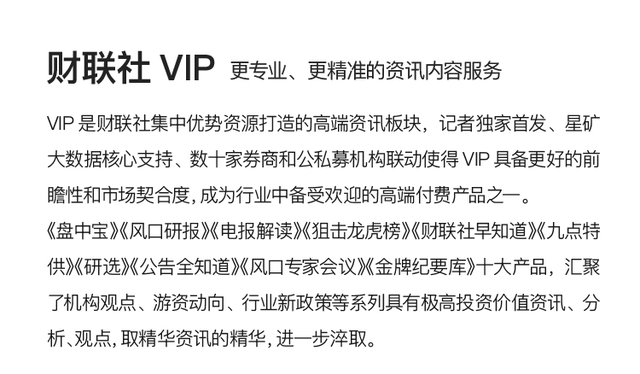 注:财联社VIP为内容资讯产品,并非投资建议。以下内容仅为资讯价值展示非对相关公司的推荐建议,非未来走势预测。投资有风险,入市需谨慎。