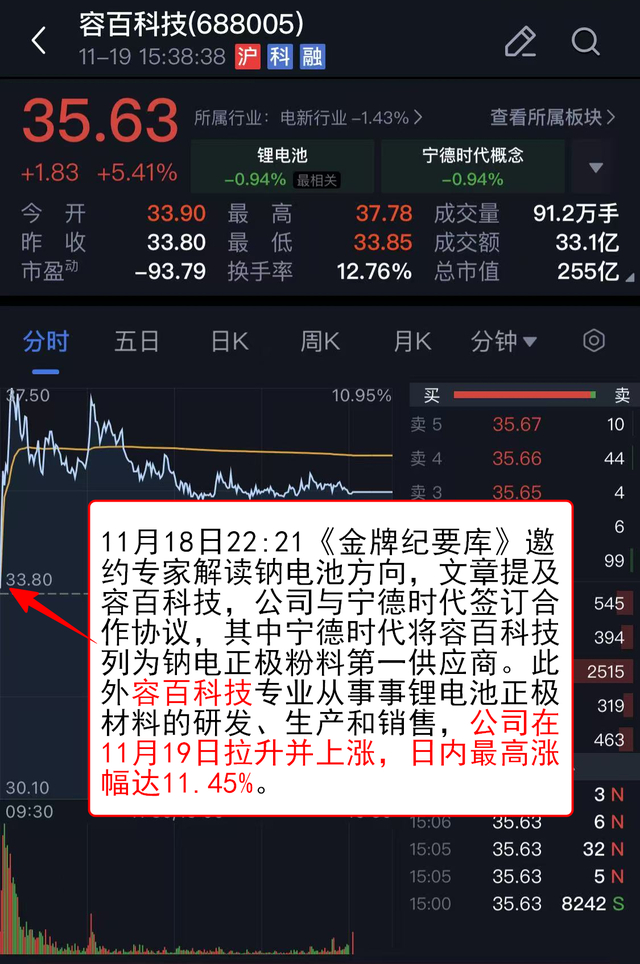 11月18日22:21《金牌纪要库》 邀约专家解读钠电池方向,文章提及容百科技,公司与宁德时代签订合作协议,其中宁德时代将容百科技列为钠电正极粉料第一供应商。此外容百科技专业从事事锂电池正极材料的研发、生产和销售,公司在11月19日拉升并上涨,日内最高涨幅达11.45%。