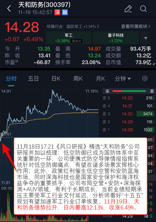 11月18日17:21《风口研报》 精选“天和防务”公司研报并加以梳理:低空防御已成为国防体系中至关重要的一环,公司便携式防空导弹情报指挥系统针对低空防御痛点,有望在诸多场景发挥核心作用;此外,政策红利催生低空空管和安防蓝海市场,同时深海科技也是国家安全保护和海洋权益争夺的重要抓手,公司布局空管+安防+深海探测+AUV领域,有利于长期成长;当前业绩短期承压主要受军工行业交付延迟,分析师看好“十五五”规划有望加速军工行业订单恢复。11月19日,天和防务强势拉升,日内最高12.13%,收涨6.49%。